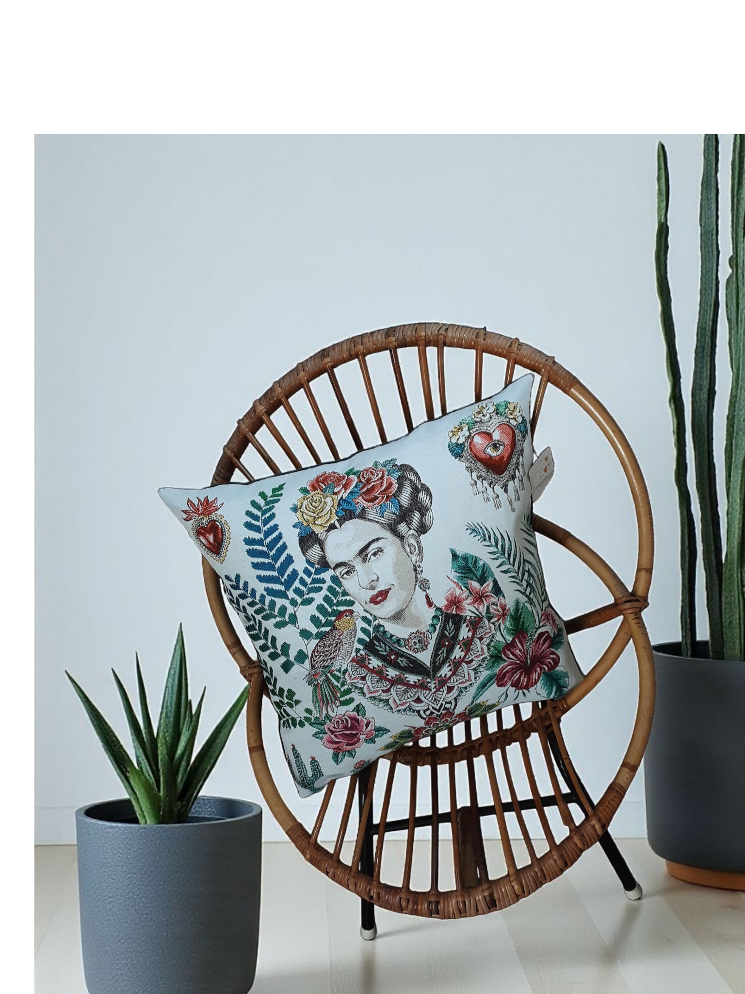 Geef je interieur een vrolijk, kleurrijk en kunstzinnig accent met dit unieke handgemaakte kussen met een ingeweven afbeelding van Frida Kahlo. Het kussen is gemaakt van hoogwaardige geweven Jaquard stof.