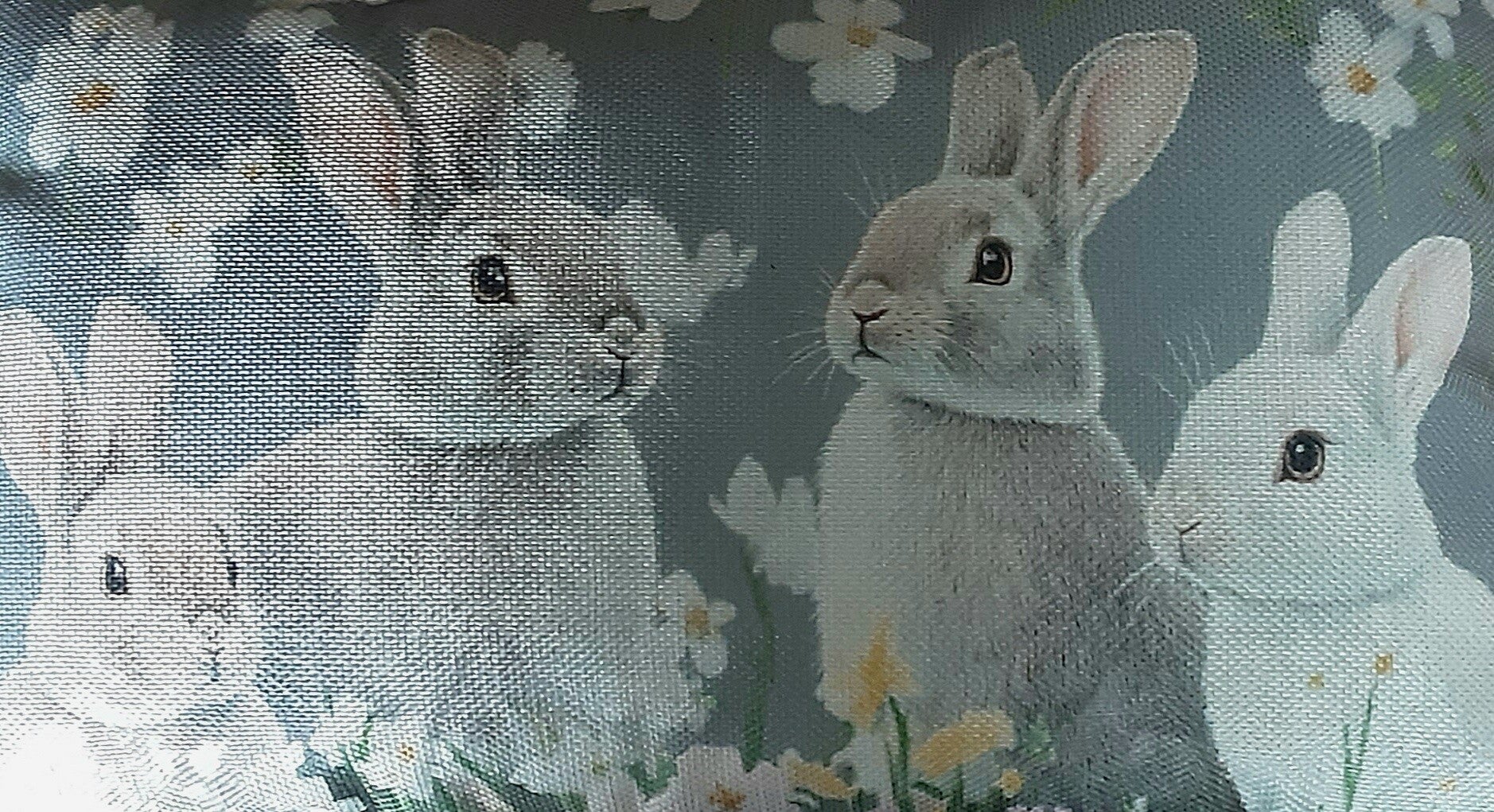 - Stevige linnenlookstof;polyester. Voor en achterkant bedrukt met snoezige konijnen.