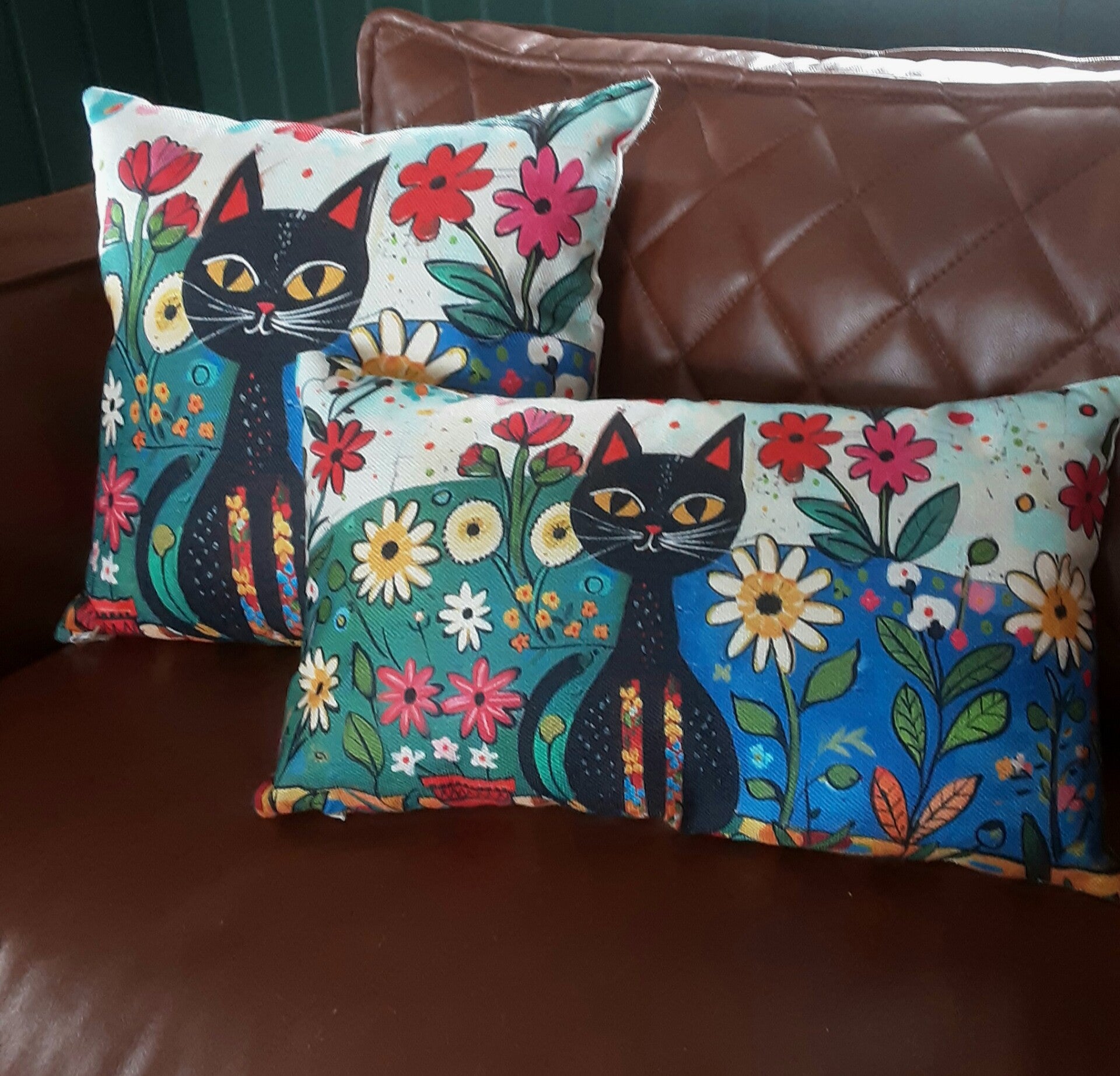 Geef je interieur een vrolijke touch met dit kussen met print van een zwarte poes, gehuld in bloemen. Perfect voor kattenliefhebbers en een speels accent op de bank, bed of favoriete leesstoel.
