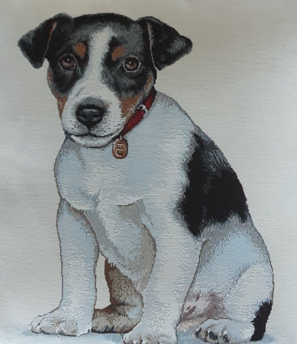 Geef je interieur een vrolijke touch met dit unieke, handgemaakte kussen met een ingeweven Jack Russel print. Perfect voor hondenliefhebbers en een speels accent op de bank, bed of favoriete leesstoel.
