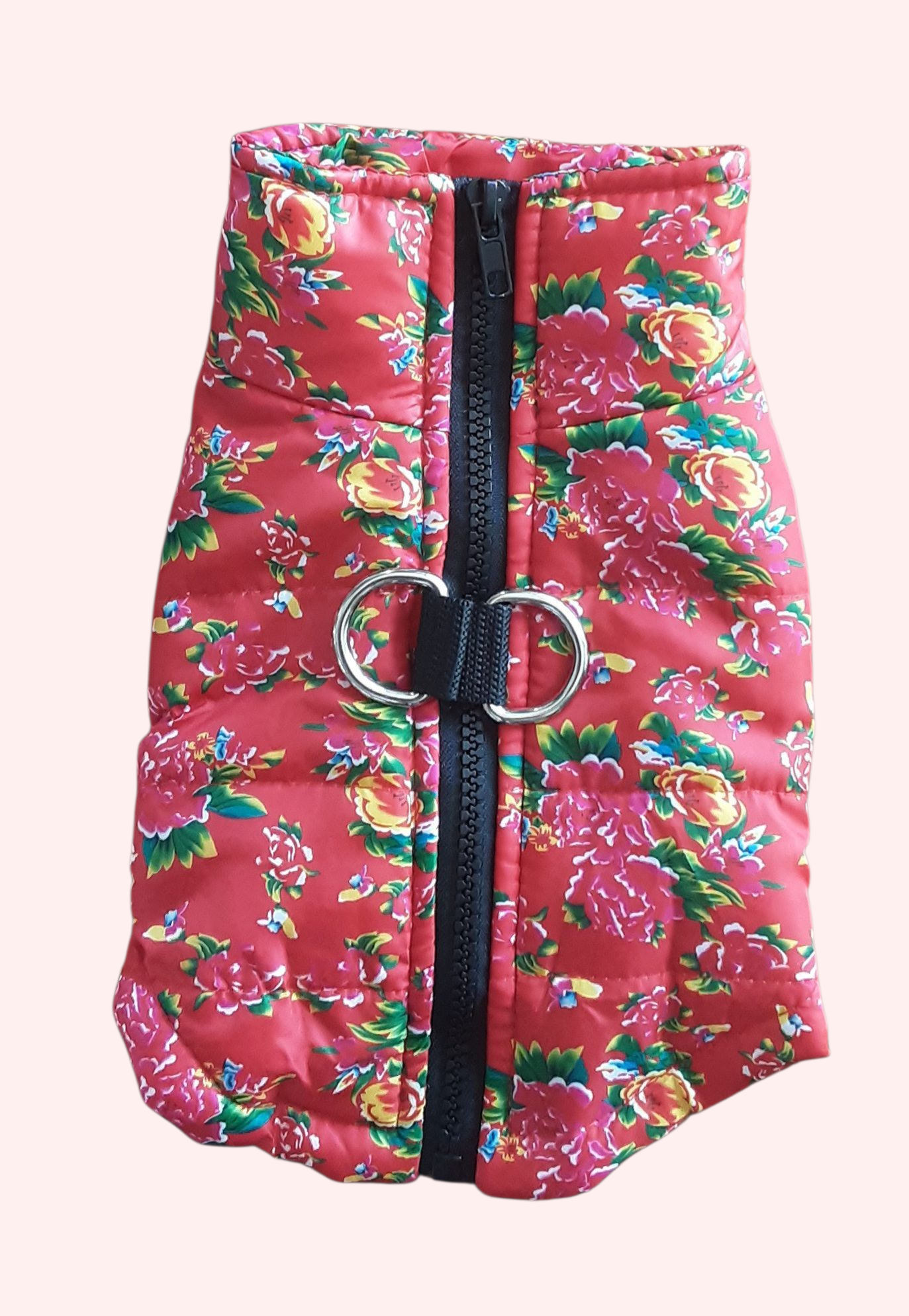 Geef je hond een unieke look met dit vrolijk, gewatteerde hondenjasje met gezellige bloemetjes! Perfect voor koude dagen, een wandeling in de regen of gewoon om extra schattig rond te lopen.