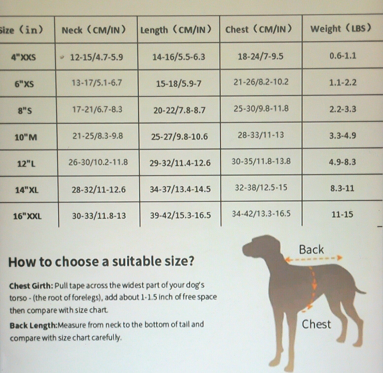 Mocht je twijfelen tussen een maat dan is het het beste om de grootste maat te kiezen. Zie de laatste afbeelding voor het maattabel van dit hondenjasje.