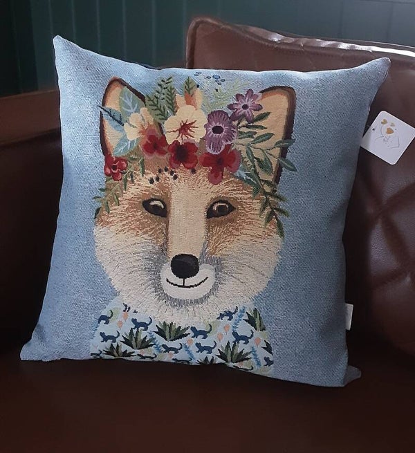 Prachtig handgemaakt kussen met geweven afbeelding van een vosje– Uniek,kleurrijk en stijlvol!