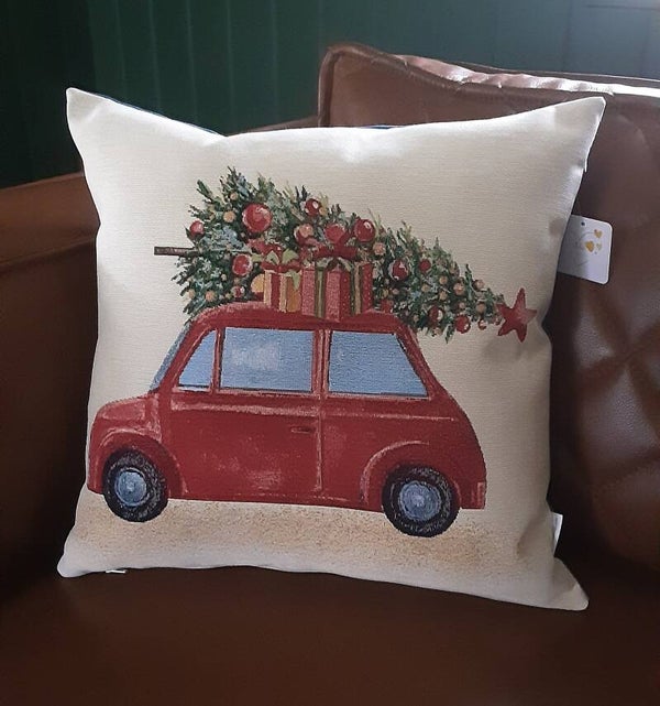 Breng de kerstsfeer in huis met dit prachtige kussen met geweven afbeelding van een Oldtimer met kerstboom.