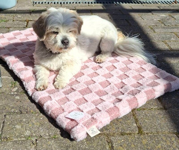 Een lekker zacht hondenkleedje met blokjesprint in roze.